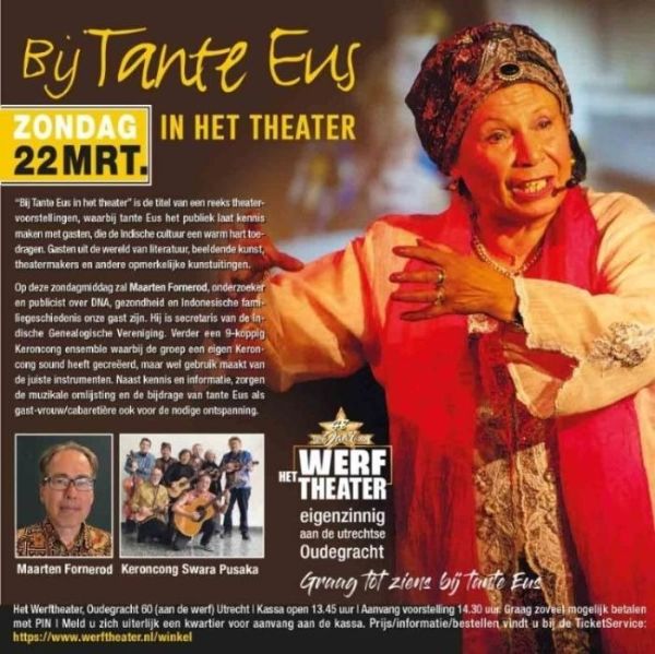 Met als bijzondere gast Maarten Fornerod, verbonden aan de Indische Genealogische Vereniging. Hij vertelt over hoe je het beste je familiegeschiedenis kunt onderzoeken. Keroncong Swara Pusaka treedt op en natuurlijk is tante Eus de hartelijke gastvrouw. Alle informatie over de voorstelling vindt u hier.
