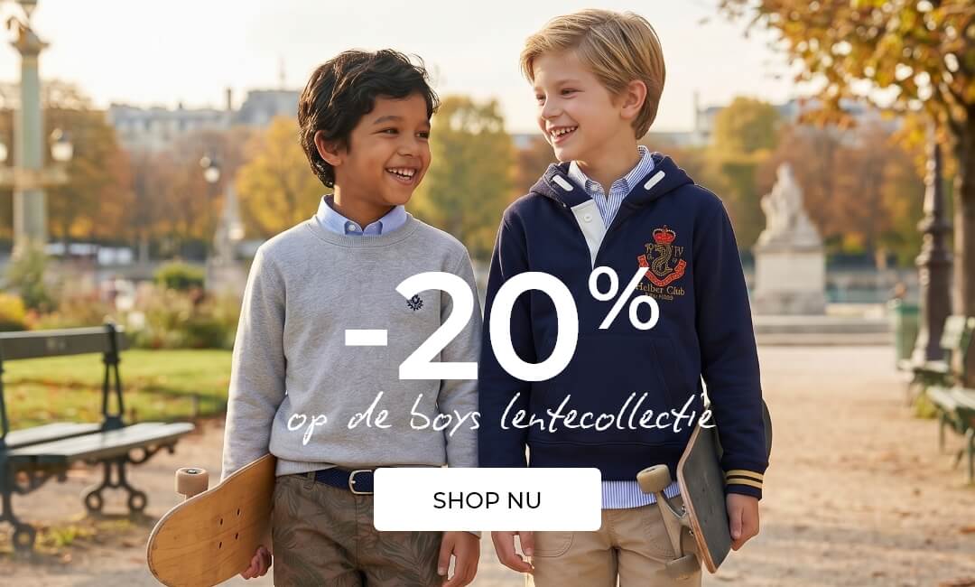 *20% korting op de boys lente-zomercollectie van 2026. Niet cumuleerbaar en niet van toepassing op reeds geplaatste bestellingen. Prijswijzigingen en/of typfouten voorbehouden. |