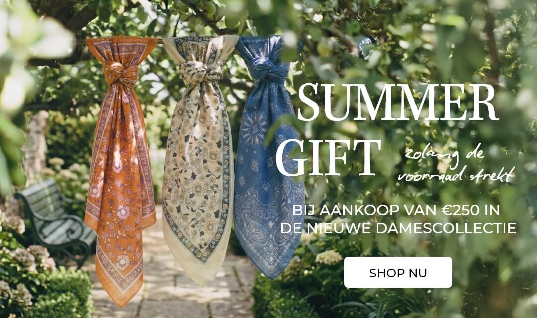 *Ontvang een set van 2 sjaaltjes cadeau bij aankoop van €250 in de dames lente-zomercollectie 2026, exclusief accessoires. Kies zelf jouw 2 favorieten uit de 7 kleuren, zolang de voorraad strekt. Prijswijzigingen en/of typefouten voorbehouden. |
