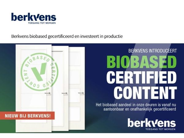 Berkvens uit Someren is de eerste Nederlandse fabrikant van binnendeuren met een biobased certificaat (BRL 7010). Alle standaard binnendeuren bevatten al meer dan 80% hernieuwbare grondstoffen en zijn voortaan ook aantoonbaar biobased leverbaar. Met deze certificering wil Berkvens vooral verder bouwen aan duurzame productontwikkeling en een lagere milieu-impact. |